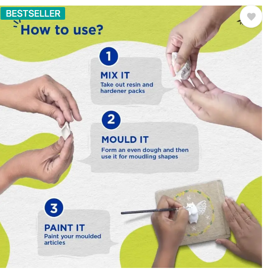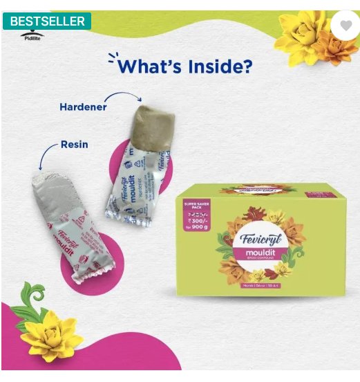 Mix It: Mould It has a strong epoxy resin base and hardener that needs to be mixed well before using the product. Its non-sticky nature makes it very easy to work with. Mould It: Moulding is made super easy with the soft and pliable clay. The mould dries in 20 minutes and sets in 90 minutes, giving you the perfect glossy finish! Paint It: Make your own masterpiece like murals, jewellery, and décor items with numerous textures. You can decorate these finished pieces with acrylic colours, glass colours, and 3D outliners. User-friendly: Both professionals as well as aspiring artists prefer Mould It,thanks to its ideal setting time and easy to use versatile DIY craft nature. Fuel your imagination: Fevicryl Mould It can help you mould your imagination into reality and create shapes and 3D works of all art like wall hangings, vases, murals, etc.