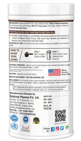 Floral Nutrition Daily Protein Shake: It has a balanced blend of high-quality proteins, Herbal blends, Carbohydrates, vitamins & minerals. Storage Condition: Store in cool, dry, and hygienic place. Protect from direct sunlight. Once opened use contents within a month. The direction of Use: Add 1 Scoop (Approx. 30 gm) for 200 ml milk or drinking water stir quickly to mix well. Daily Protein quota with a good taste of Vanilla, so no compromise on flavor. WHY TRUST: Floral Nutrition is vegetarian and FSSAI approved. No side effects, ISO & GMP Certified.