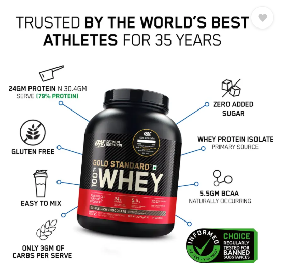 OPTIMUM NUTRITION'S GOLD STANDARD 100% Whey uses pure Whey Protein Isolates as the primary ingredient. Combined with ultra-filtered whey protein concentrate, each serving provides 24 grams of all-whey protein and 5.5 grams of naturally occurring Branched Chain Amino Acids (BCAAs) which are prized by athletes for their muscle building qualities. With 10 tempting flavors to choose from, ON GOLD STANDARD 100% Whey gives you plenty of ways to keep workout recovery interesting. To instantly check the authenticity of your ON product, SMS us your 6 digit unique code (on the pack) at 57575 or visit our website AUTHENTICATEON.in