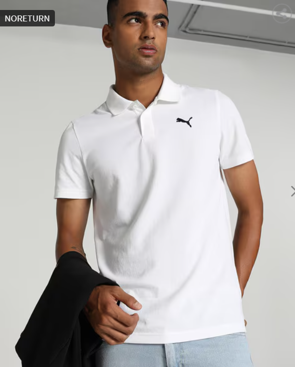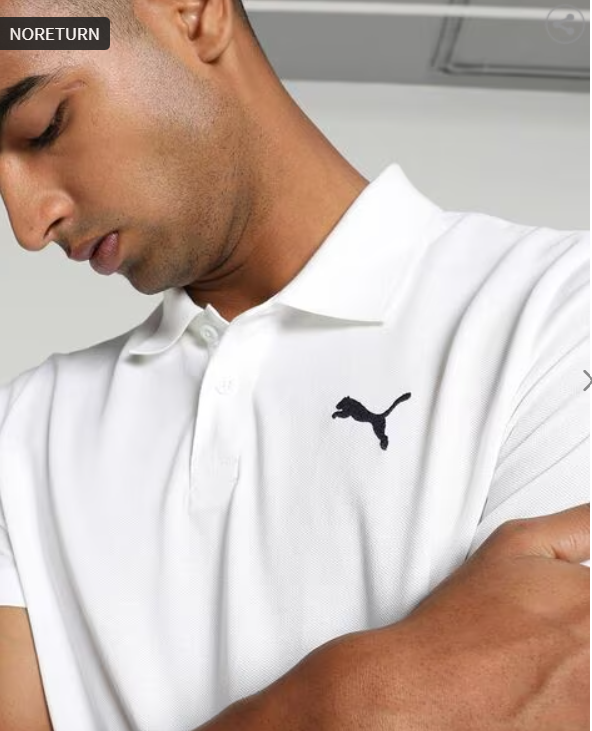 - Step up your game with the essentials men's polo t-shirt from puma. With ribbed collar and a classic cat logo branding, this polo offers both style and function for your next sporting event or casual outing. The breathable fabric keeps you cool and comfortable, while the sleek design ensures you look your best both on and off the field.