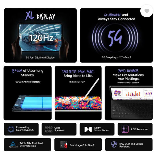 With a 30.7cm (12.1-inch) XL display, the Redmi Pad Pro offers the perfect balance for entertainment and productivity. Enjoy immersive visuals and ample space for multitasking on its generously sized screen.