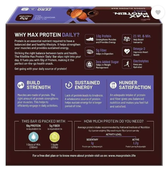 RiteBite Max Protein Daily Choco Almond 10g Protein Bars with 5g Fiber, 0 Added Sugar Protein Bars (300 g, Chocolate Almond)