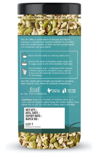 Featuring a blend of clean, non-GMO, and gluten-free raw form, these mixed seeds are free from any artificial additives, making them a natural choice for a healthy diet. The seeds are carefully selected to ensure purity and quality, providing a wholesome snack or ingredient for various dishes.