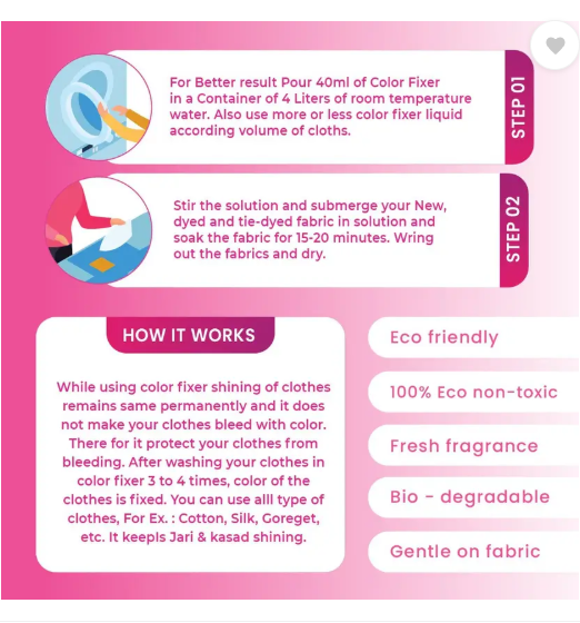 One notable feature of this colour fixer is its delightful floral fragrance, which adds a pleasant touch to the fabric-fixing process. The subtle yet refreshing scent lingers on the fabric even after washing, providing a subtle hint of freshness. Unlike other fixers with strong chemical odours, this floral fragrance creates a more enjoyable laundry experience.