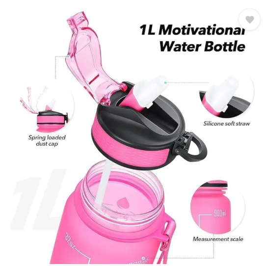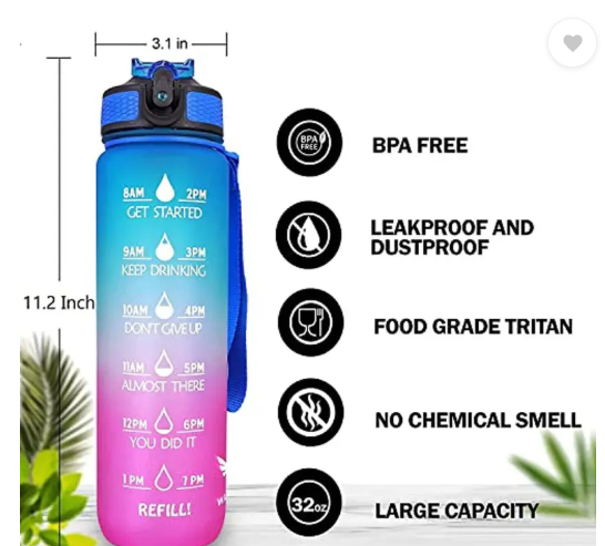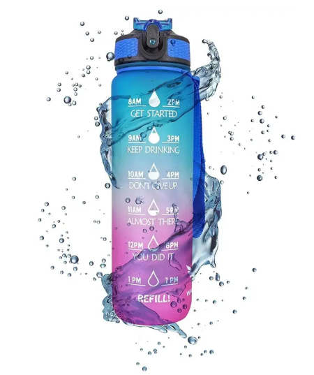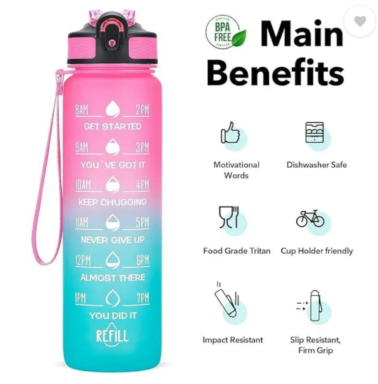 Drink more water To A Healthier You Innovative Time Marker - Monitor your daily water intake Of all the things towards a healthier you, the easiest is drinking 2 liters of water daily (It is not like we are asking you to eat broccoli daily) Our bottle will travel with your everywhere - office, gym or outdoor. Over 66% of people are chronically dehydrated - we don't want you to be one. Enjoy your favourite drinks with our motivational water bottle
